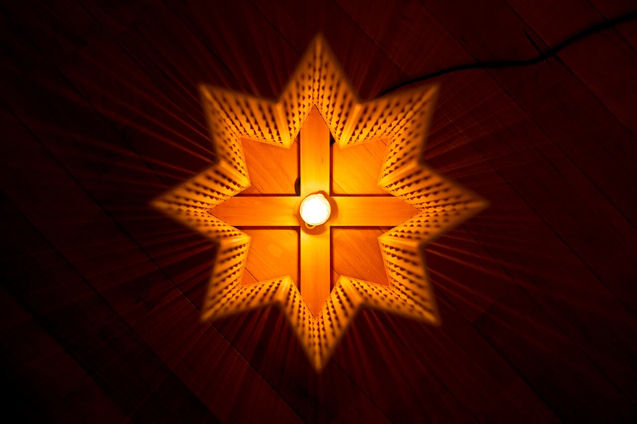 16枚の組子を互い違いに貼り合わせるという、複雑で手間の掛かる造形をしています。全高44㎝と製品群の中では中型の部類に属しますが、八芒星の美しい造形はサイズを超えた存在感を示し、他に類を見ない荘厳なまでの光芒が見るものを圧倒します。