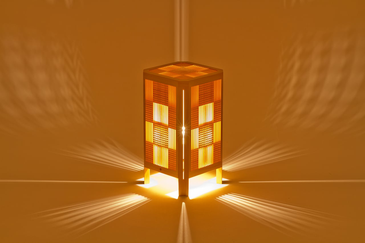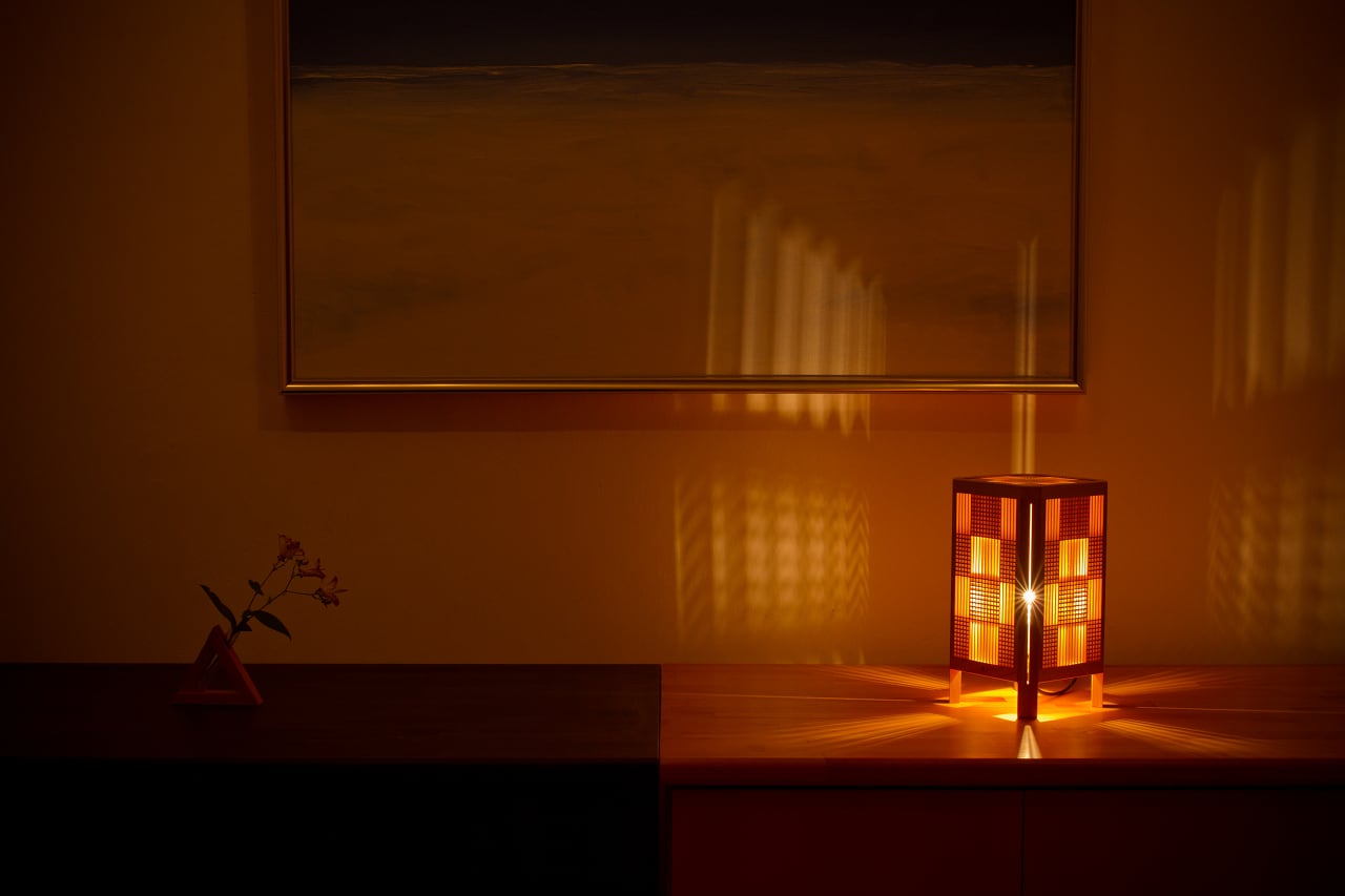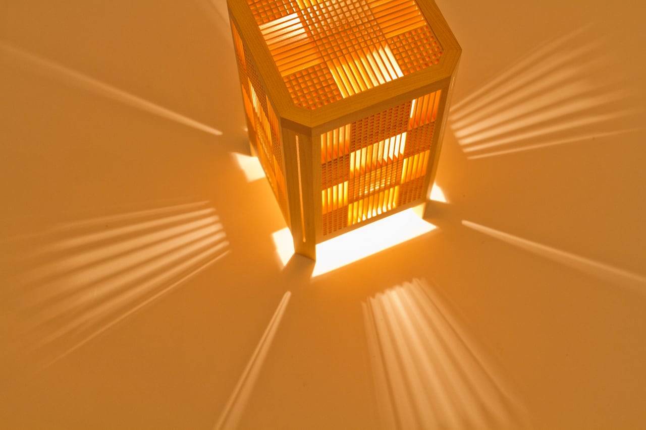 極薄の組子で構成された市松模様はとても美しく、それだけで高度な技の工芸品といえるものですが、そこへ四隅に配されたスリットが加わることで更にデザイン性を高めています。スリットから延びる光は鋭く研ぎ澄まされた刃のようで、名前の紫電となった所以となっています。