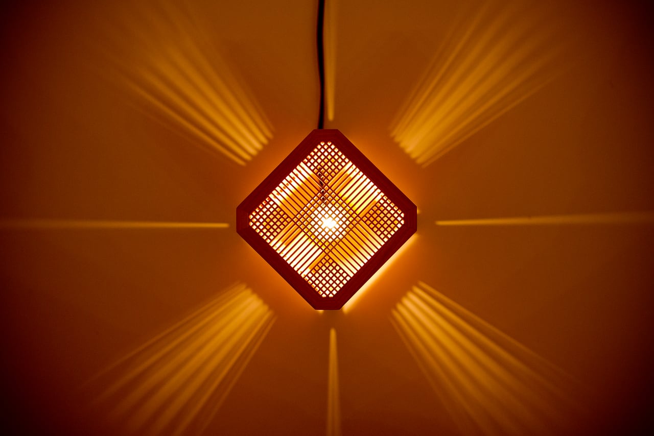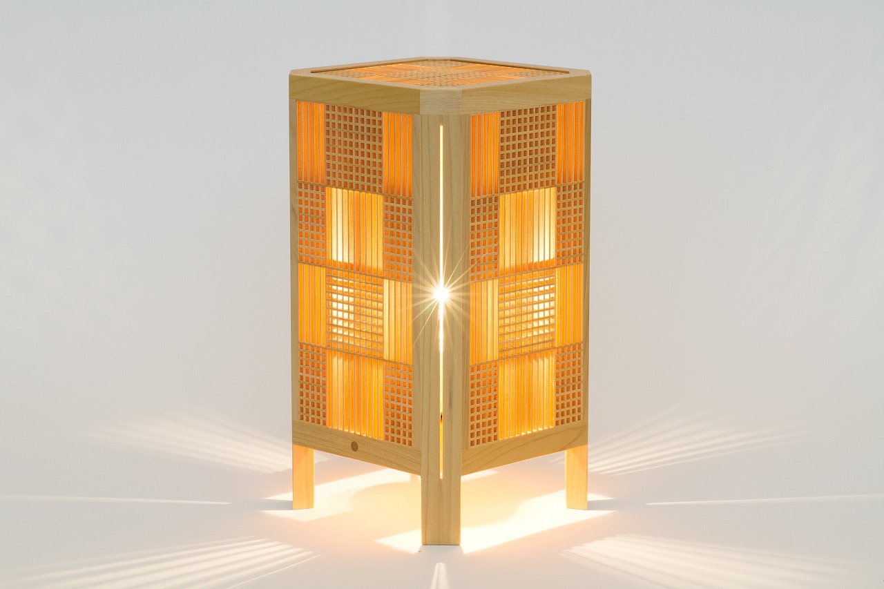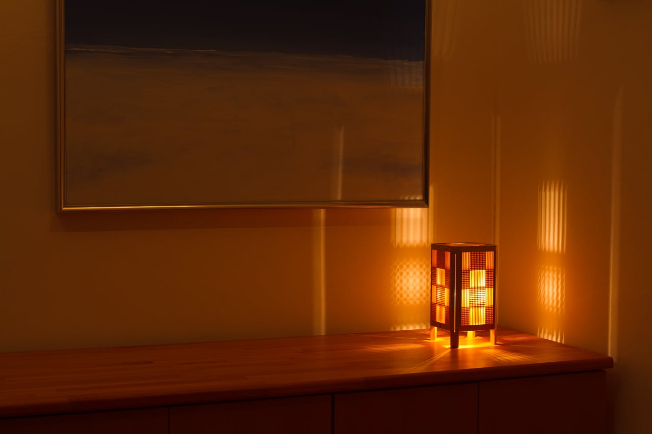 極薄の組子で構成された市松模様はとても美しく、それだけで高度な技の工芸品といえるものですが、そこへ四隅に配されたスリットが加わることで更にデザイン性を高めています。スリットから延びる光は鋭く研ぎ澄まされた刃のようで、名前の紫電となった所以となっています。